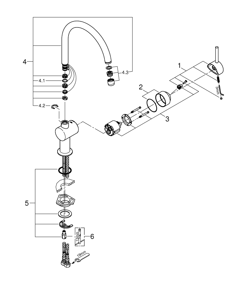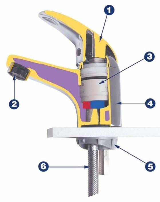 Самый простой смеситель – однорычажный. Он состоит из следующих элементов: