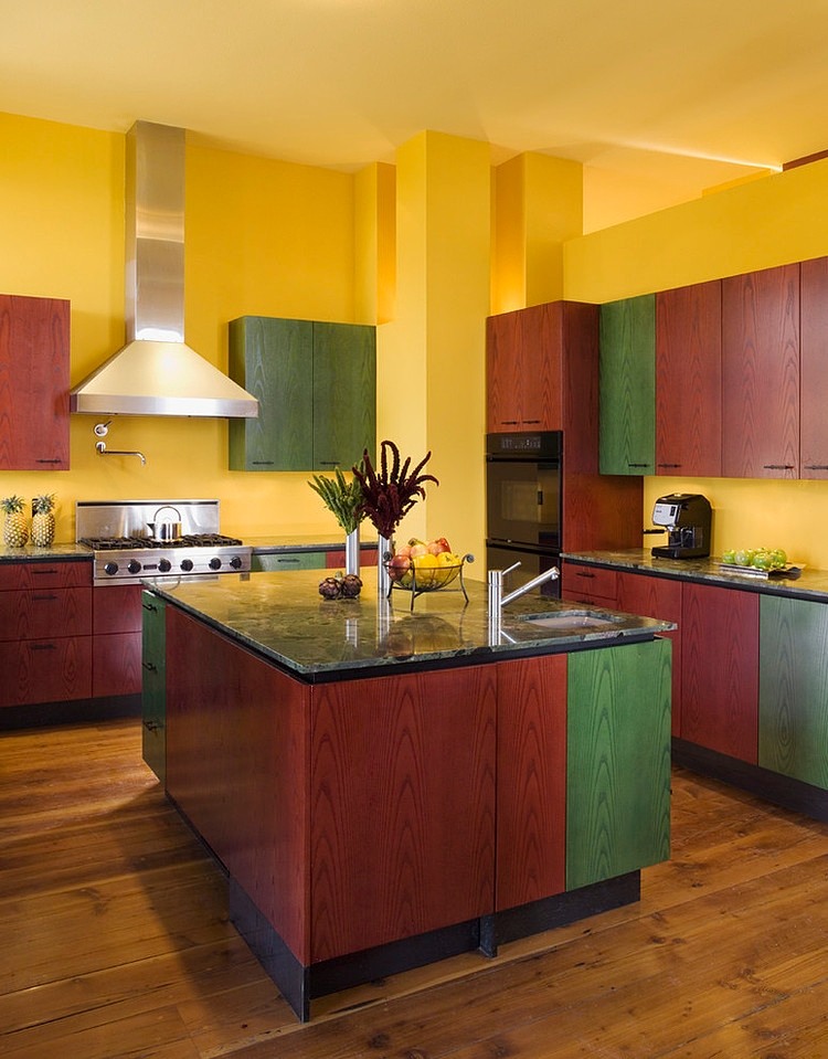 Подобные оттенки будут идеально сочетаться на кухонном гарнитуре: стены и потолок будут нейтрального цвета, а пол — выполнен в темном цвете. Встраиваемую технику для ярких оттенков стоит подбирать ближе к темному цвету.