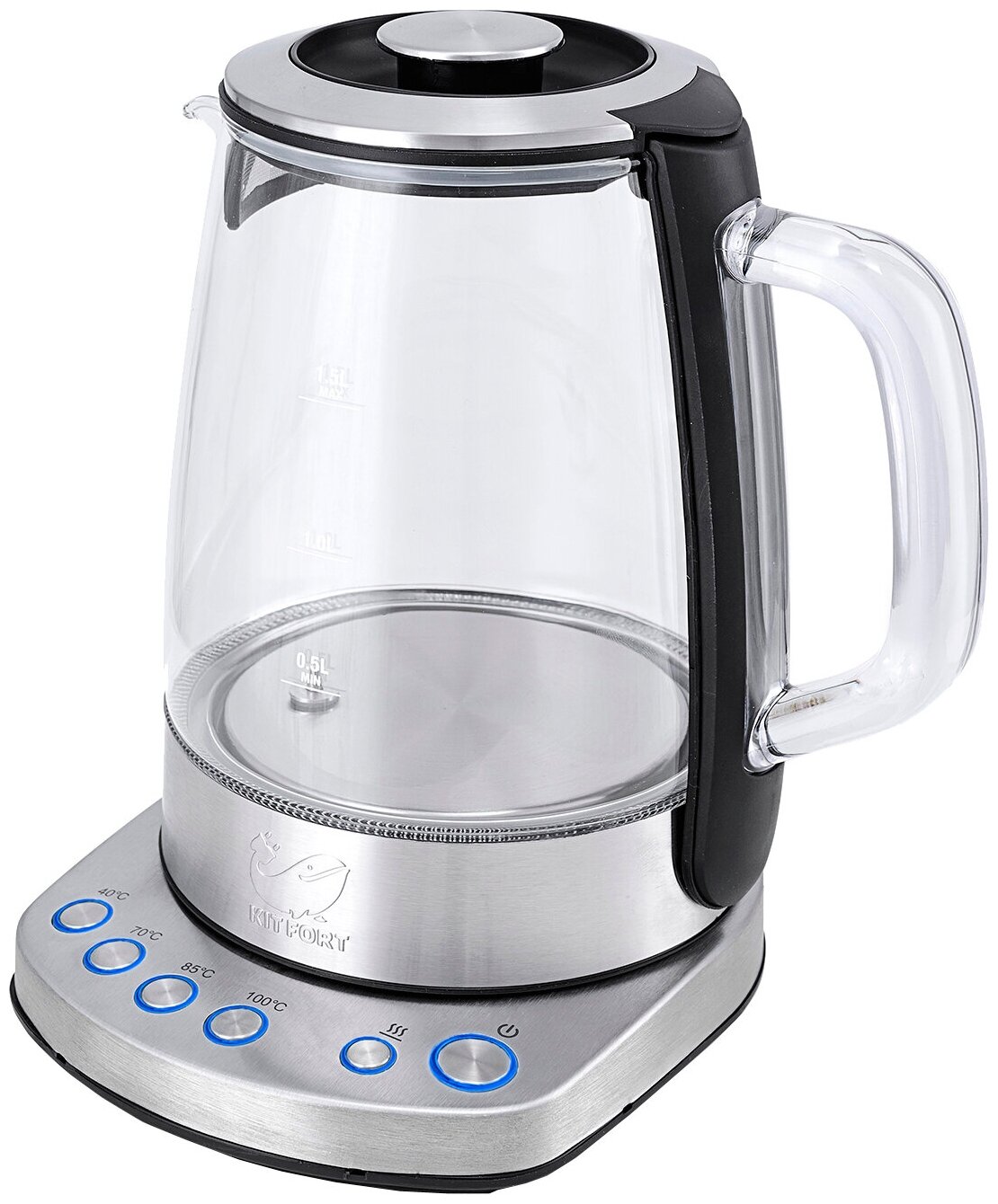 Еще одна модель в рейтинге, которая порадовала соотношением цены и функционала. Чайник оснащен пятью температурными режимами, таймером, опцией поддержания тепла. Минимальная температура нагрева в 40ºС позволяет заваривать разные виды напитков, в том числе белые, желтые или зеленые чаи. Конструктивно в модели предусмотрена металлическая колба для заваривания чая или трав. В комплекте с прибором покупатель получает специальную подставку для варки яиц в чайнике. Отдельного внимания заслужил дизайн устройства – классический, но нетрадиционный. Подсветка меняет цвет, в зависимости от степени нагрева воды, добавляя визуальной эстетики.