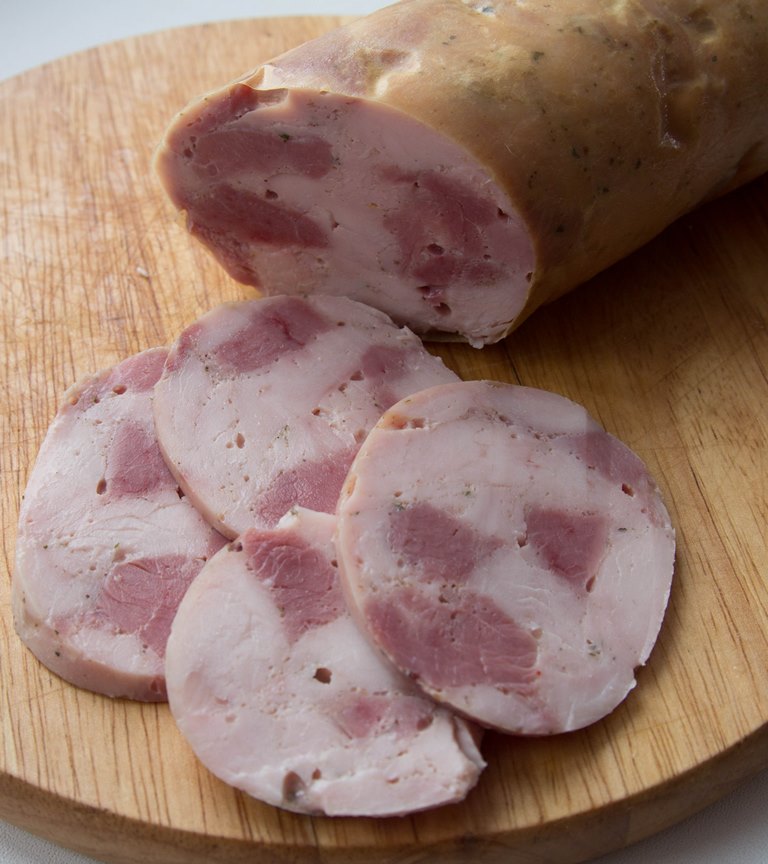 Охлаждение. Форма вынимается (мясо остается внутри) и охлаждается. Затем он отправляется в холодильник на ночь. На следующий день форму открывают и вынимают ветчину. Ветчина навсегда сохраняет форму формы, в которой она находилась.