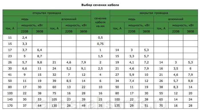 По таблице видно, что мне нужен кабель сечением 6мм2 (для подключения к однофазной сети 220В) или 2,5мм2 (для трехфазной 380В).