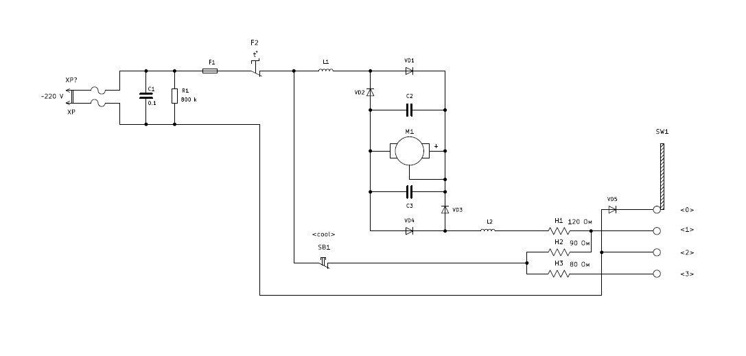 При нажатии на кнопку SA2 управляющий электрод симистора G через токоограничивающий резистор R5 соединяется с выводом A2 в результате чего симистор открывается, сопротивление между его выводами А1 и А2 становится близким к нулю и все напряжение питающей сети 220 В после выпрямления диодным мостом VD1-4 прикладывается к выводам электродвигателя. Двигатель начинает вращаться с максимальной скоростью.