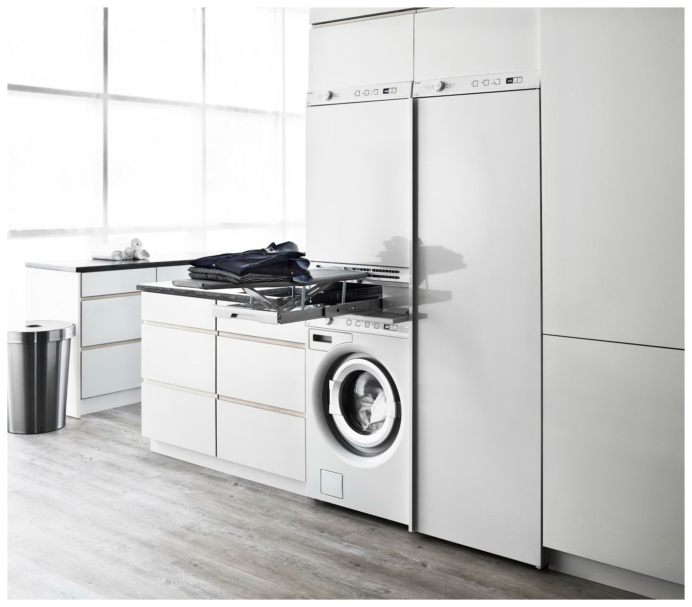 Установка машин в штабель — вариант, когда пространство ограничено. Если это ваше требование, будьте осторожны, чтобы иметь или покупать машины, которые можно штабелировать. Ширина пространства уменьшается до менее 30 дюймов (76 сантиметров) для большинства моделей, когда они сложены в стопку, а высота обычно составляет менее 6 футов.В этом шкафу для белья также есть гладильная доска, которая складывается из шкафа.