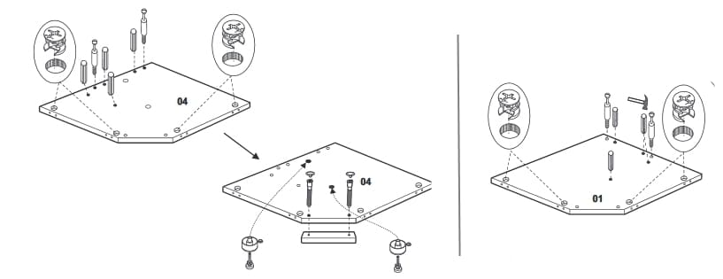 Вставьте винт в одно из отверстий с потайной головкой в верхней части так, чтобы крепеж Lazy Susan находился снизу — рама с двумя отверстиями в каждом углу будет обращена к нижней стороне верхней части.Вставьте винт сверху в одно из меньших отверстий в раме.