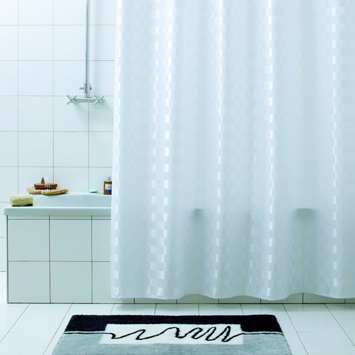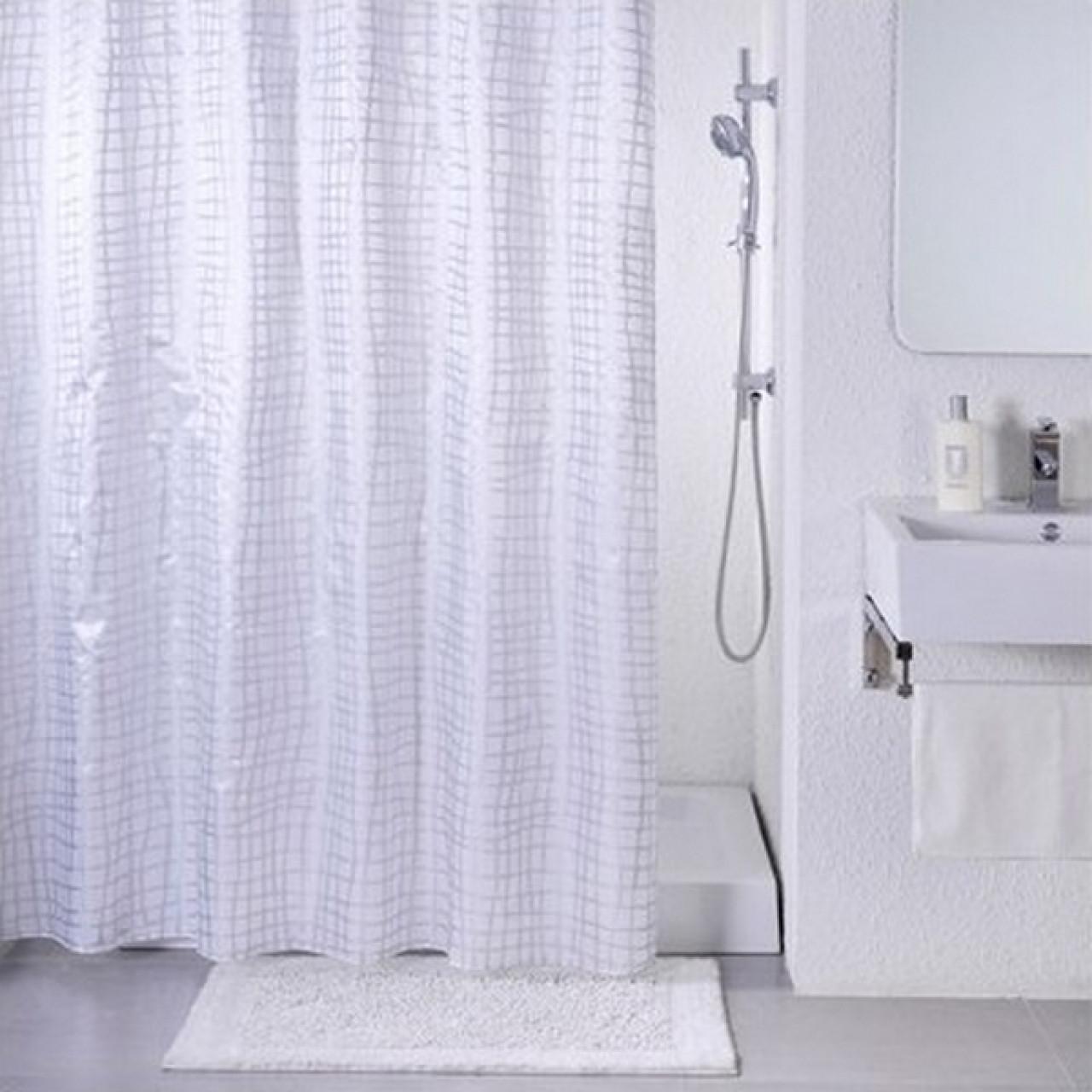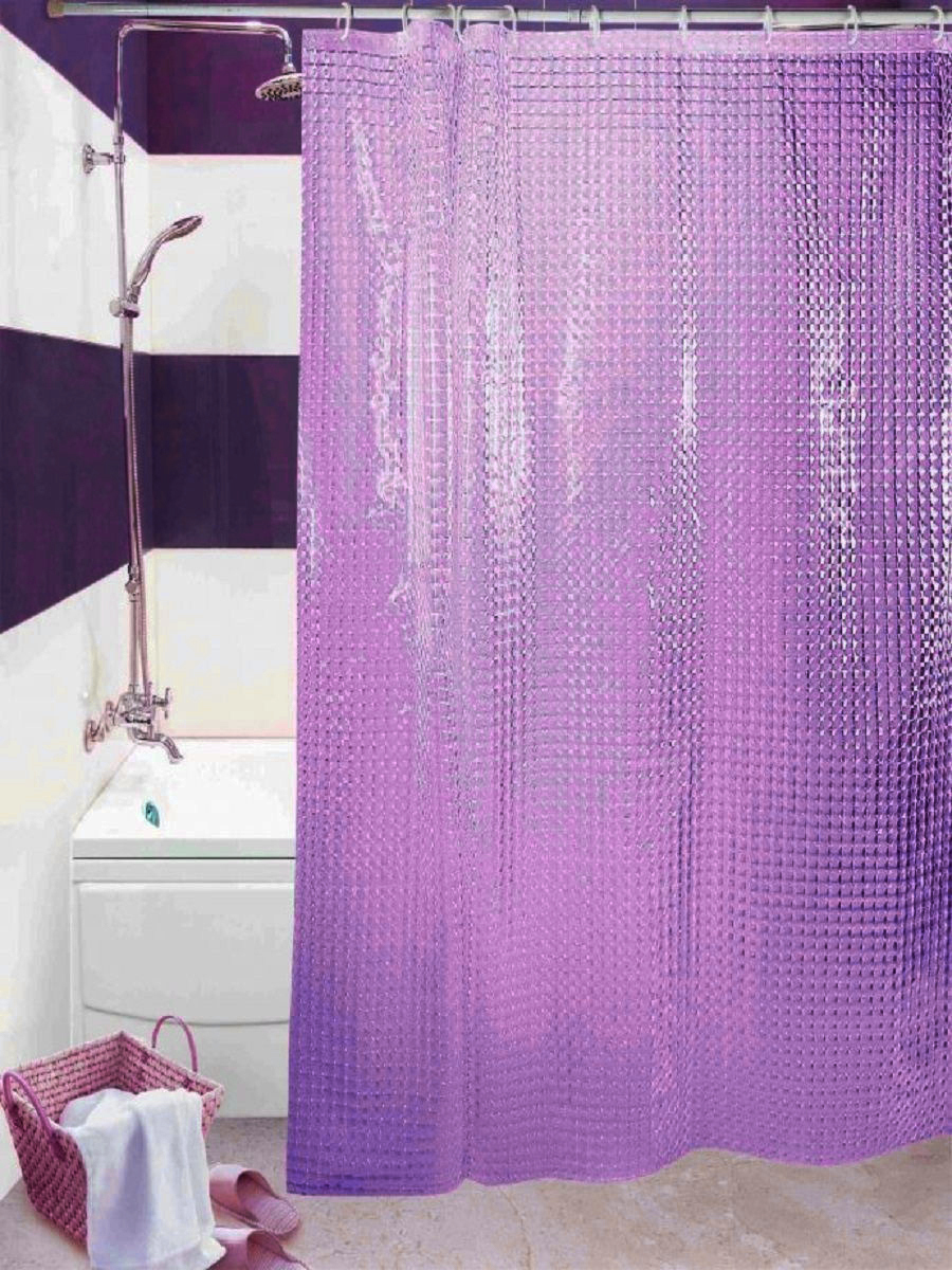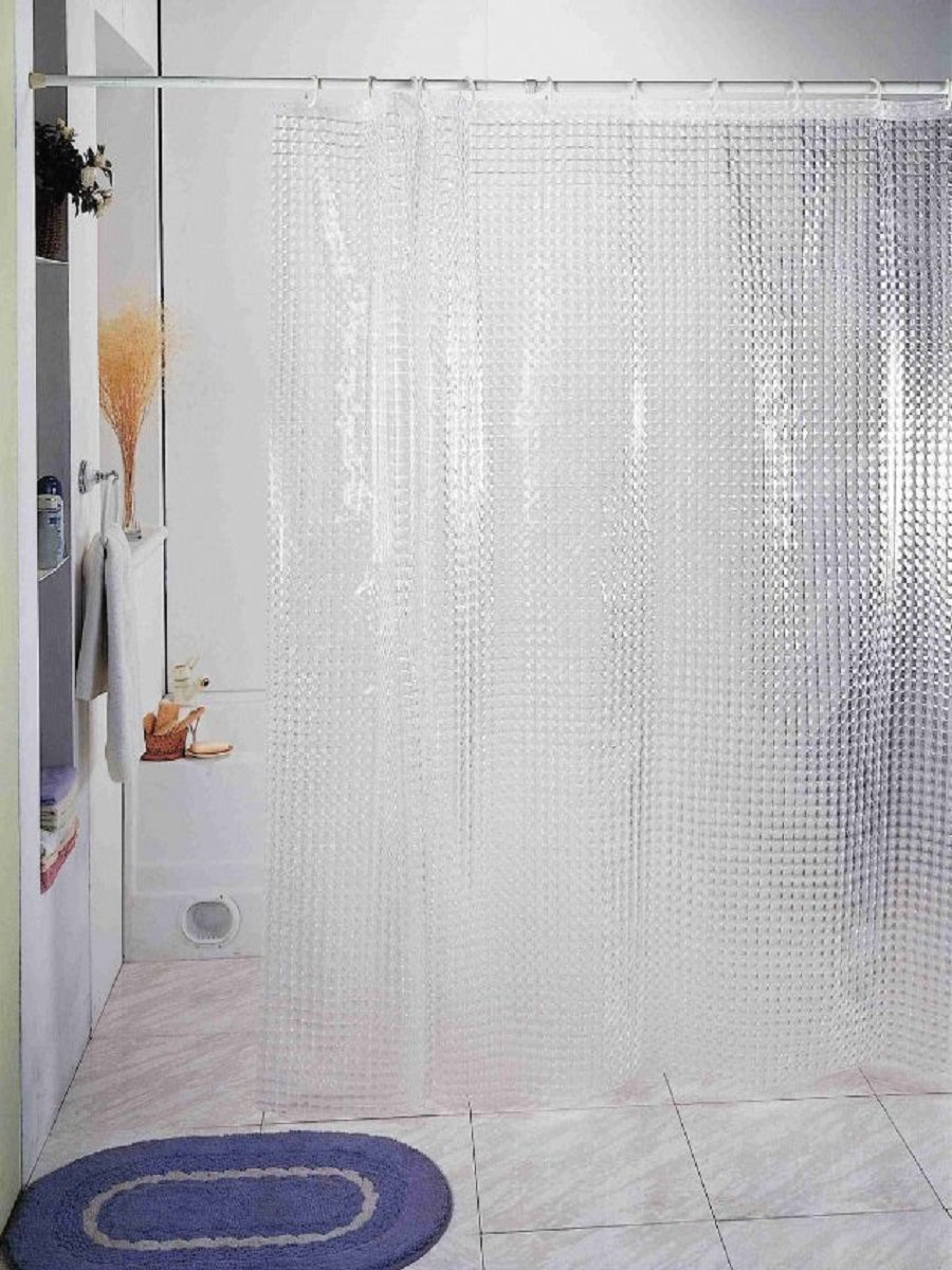 Объясняется это тем, что натуральные ткани просто не выдержат регулярного воздействия влаги, а на их поверхности в скором времени начнется процесс образования и размножения различных грибков и бактерий. Исключением являются дорогостоящие дизайнерские модели из льна или другой натуральной ткани, пропитанной специальными растворами. Тканевые шторы очень приятные на ощупь. Многие модели обладают утяжелителем на нижнем крае. Это позволяет шторке держать форму и сохранять заданное ей положение. Верхний край также усилен для того, чтобы крепежные элементы плотно держались, шторка не выскальзывала под своим весом, и не оставалось следов от острых зубьев железных «крокодилов». Такой вид шторок можно стирать в стиральной машине при температуре не более 30 градусов и даже гладить на низких температурах. Срок их службы при должном уходе может достигать показателя 12 лет. Это отразилось и на их не самой демократичной стоимости. - Шторки из полиэтилена.