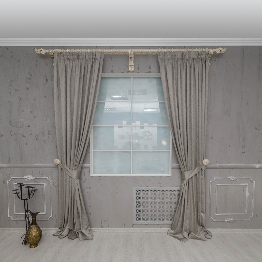 - Длинные портьеры из тяжеловесных светлых тканей актуально приукрасить темными люверсами, имитирующими ценные сплавы металла: золота, серебра или платины. Приемлемо сыграть на контрасте: скомпоновать белоснежные или молочные шторы с темным карнизом, декорированным шарообразными или фигурными наконечниками.