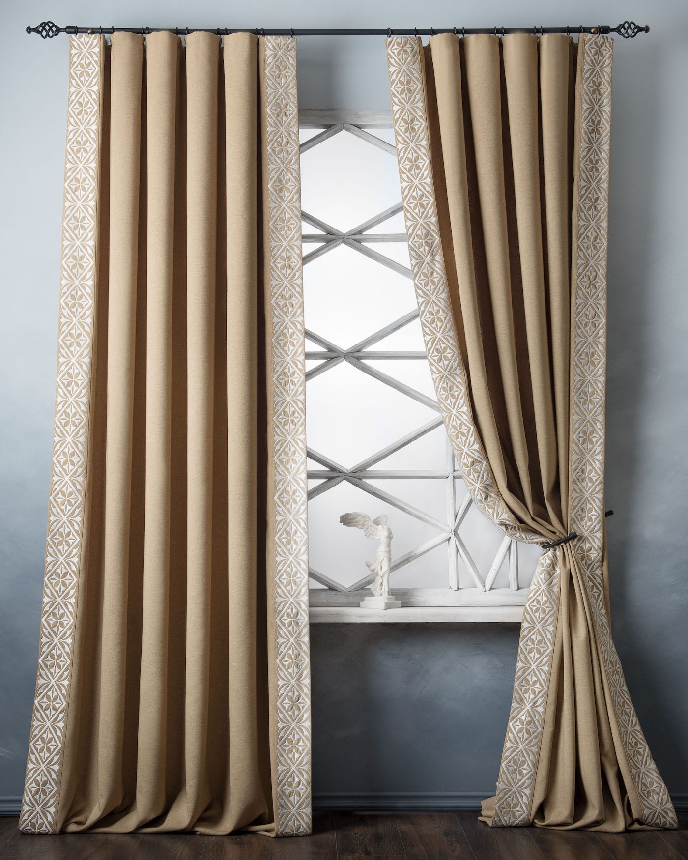 На светлом фоне выразительно видны всяческие декоративные элементы: узоры, рисунки, кружевные обшивки, кисти, плетенные шнуры, люверсы и прочая швейная фурнитура, придающая изделиям уникальный вид. Это еще одно несомненное преимущество штор из тканей светлой палитры.