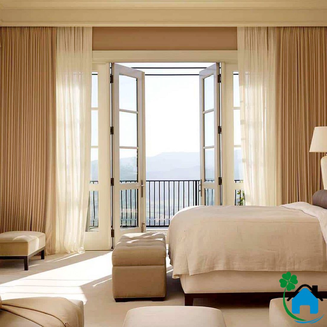- Шторы для светлой спальни целесообразно разместить не только по периметру окна, но и над дверным проемом. В былые времена большой роскошью считалась установка дверей. Поэтому в деревенских избах зачастую изолировалось пространство смежных комнат за счет занавесей до пола. Для их отделки разумно использовать тесьму или оборку типажного светлого цвета. Уместны принты с изображением бабочек, птиц, флористических мотивов.