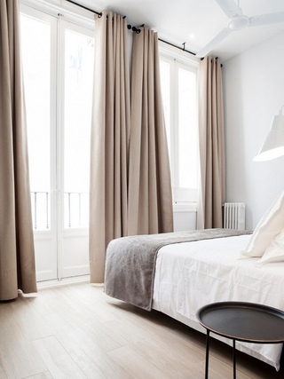 - В отельных апартаментах актуально применение светлых драпировок для оснащения окон. Они не препятствуют полномерному естественному освещению, отлично поддерживают атмосферу, располагающую к отдыху и душевной релаксации. В небольших помещениях оптимально создать целостную интерьерную композицию из однотонных или на полутон отличающихся друг от друга штор, ковров, покрывал на кроватях или декоративных подушек.
