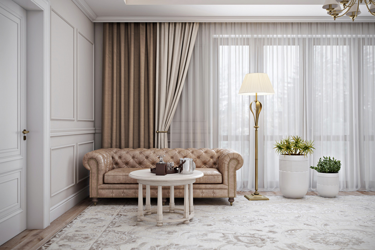 Извечно актуальная классика тяготеет к сдержанному убранству окон из-за вычурной обстановки, составленной из объемной деревянной и кожаной мебели, напольных покрытий из паркетной доски или мрамора, каменных порталов с темной отделкой. Убранство окон с белесым отсветом среди монументальной обстановки с изобилием затемняющих предметов интерьера воспримется, словно первые лучи солнца, озаряющие ночной небосклон.
