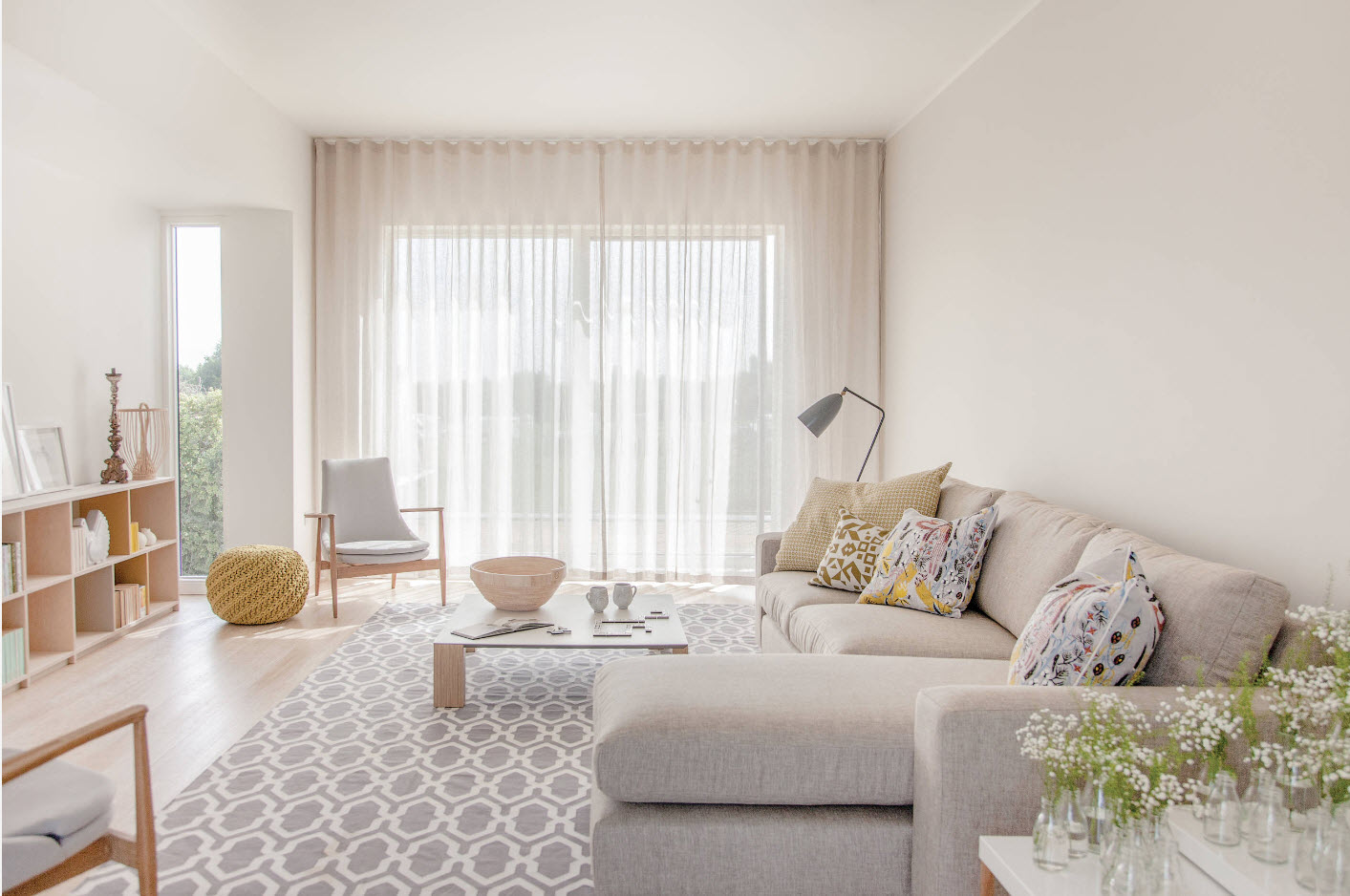 Это еще один пример того, насколько великолепной может быть гостиная, когда у вас большие окна с прозрачными шторами. Свет проникает сквозь него и мягко и деликатно воздействует на зону отдыха, которая декорирована множеством светло-серых тонов, красивыми текстурами, узорами и теплыми акцентами.
