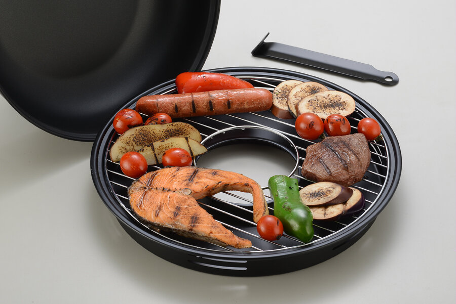 Во время приготовления блюд масло или жир стекают в поддон, а не остаются на продуктах. А огонь обеспечивает равномерное прогревание, но не соприкасается с пищей. Принцип работы очень похож на приготовление в обычном мангале: внутренняя часть разогревается и внутри «устройства» начинает циркулировать очень горячий воздух.