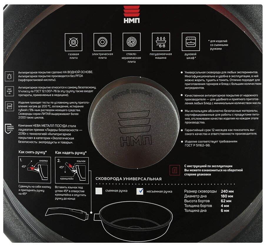 Во-вторых, отстегнув съемную ручку — сковороду можно ставить в духовку, что необходимо для блюд, которые предполагают обжаривание, а потом запекание.