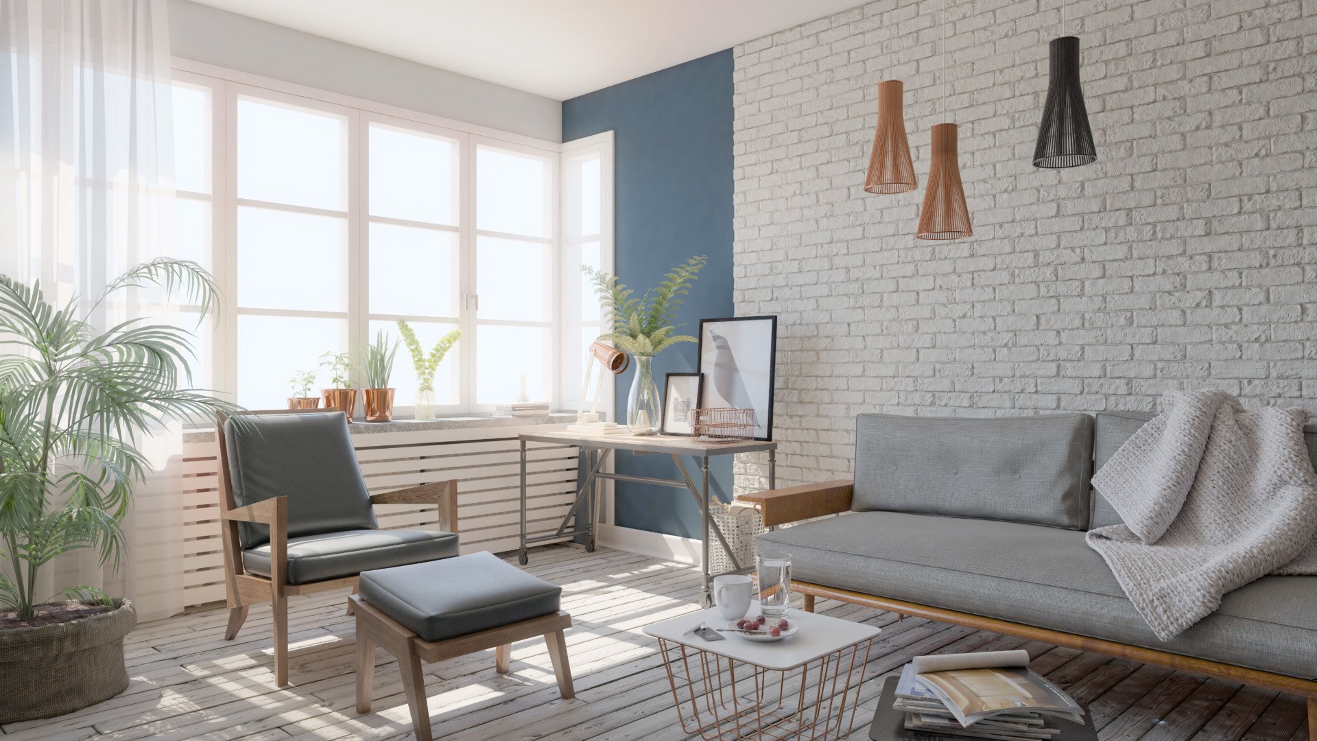 Для этого стиля характерны фактурные обои, белый кирпич, идеально подойдет для отделки сливаясь с полом в светлых тонах.