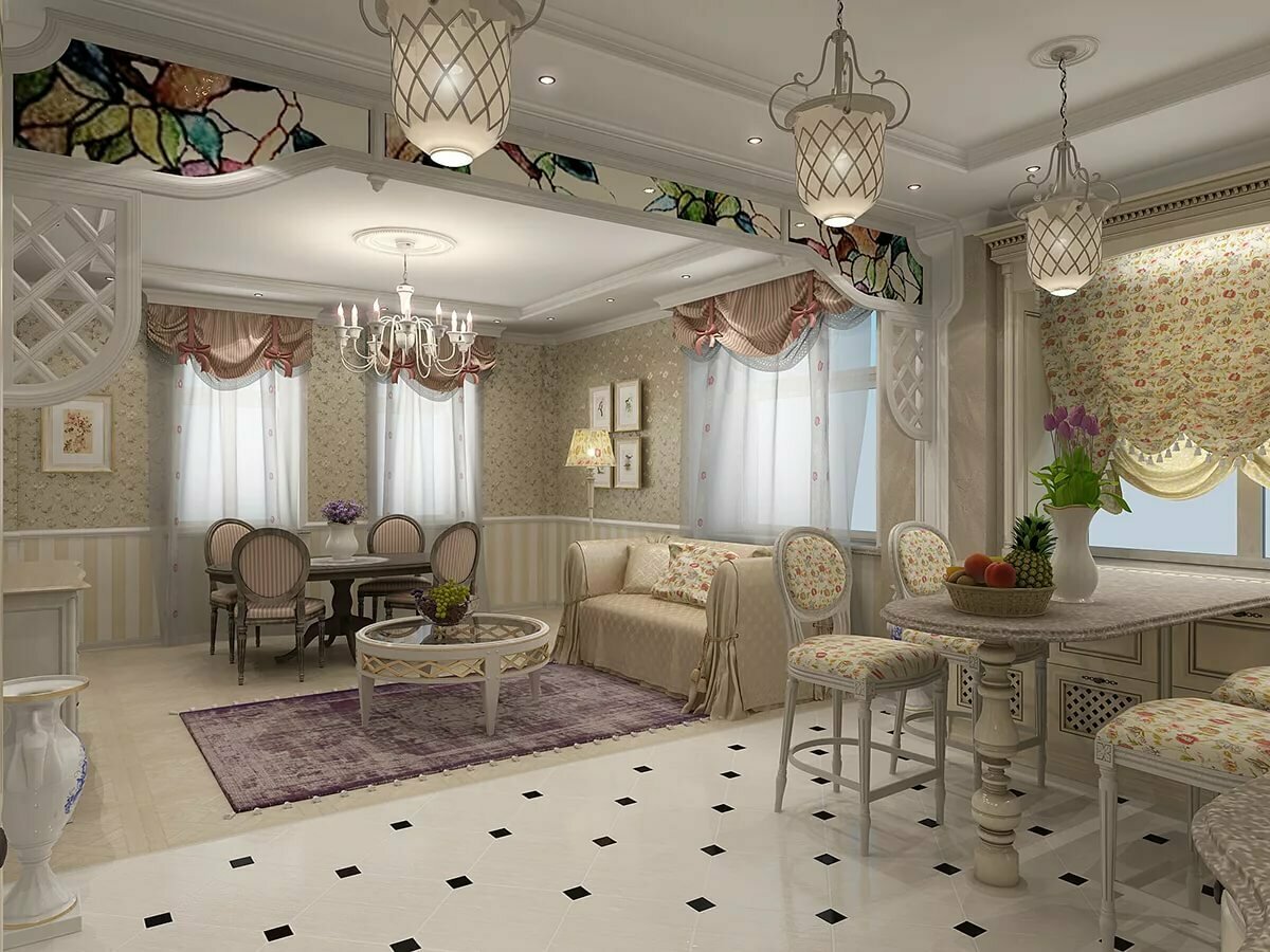 Классический стиль в оформлении совмещенной кухни и гостиной в загородном доме — это натуральные материалы, гармоничное сочетание деталей и благородные оттенки.