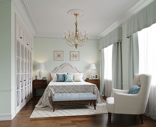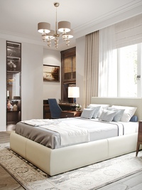 И в классической, и в современной спальне, выдержанной в американском стиле, есть разные сценарии освещения. Общий, верхний свет может и вовсе отсутствовать. Здесь главную роль играют локальные источники света. Их яркость может регулироваться диммером.