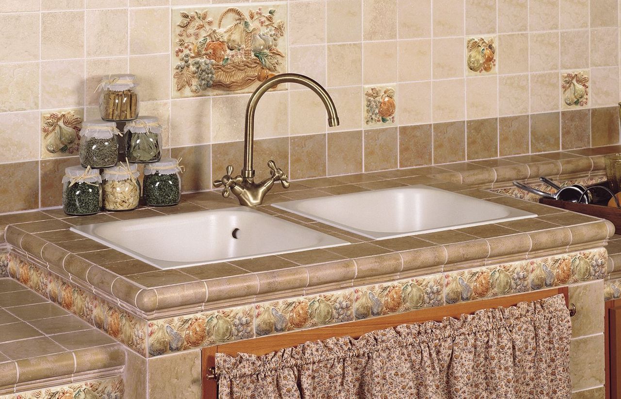 В средиземноморской стилистике, столешницы декорируют плиточными материалами с имитацией грубого камня или древесины, изделиями оттенка терракотовая земля, желтой, апельсиновой, насыщенной красной, голубой, васильковой, баклажанной, салатовой или зеленой отделкой.