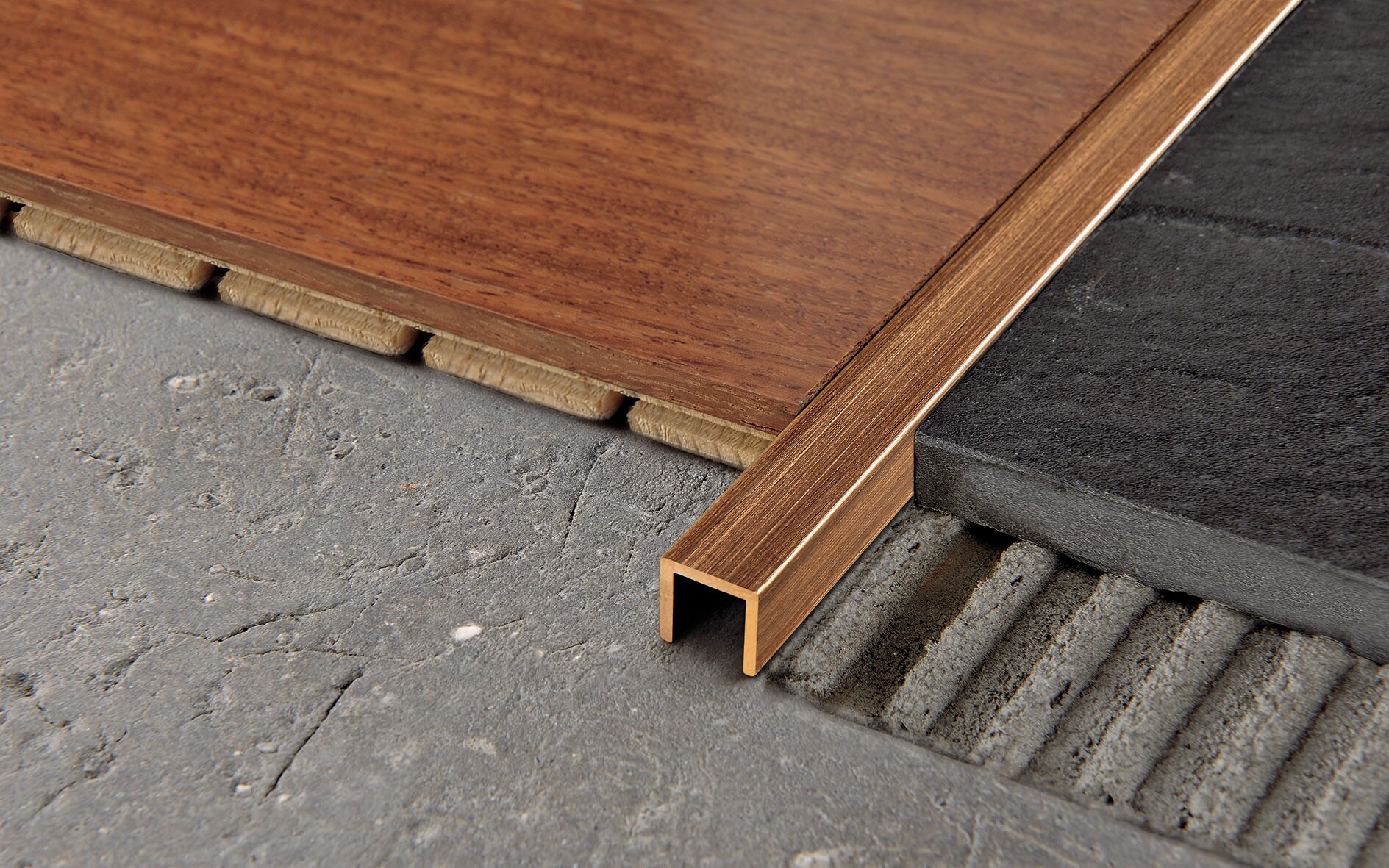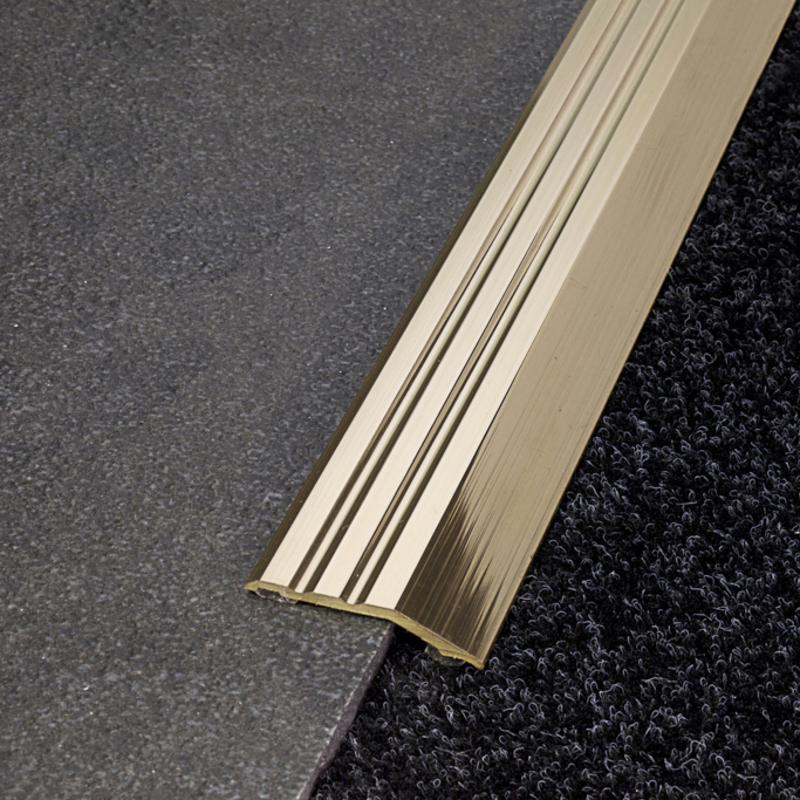Наиболее распространенным материалом для изготовления соединительных планок является алюминий. Этот вариант позволяет имитировать поверхность детали под бронзу, золото или дерево, что значительно расширяет возможности декорирования напольного покрытия. Чаще всего в продаже можно встретить 2 варианта: