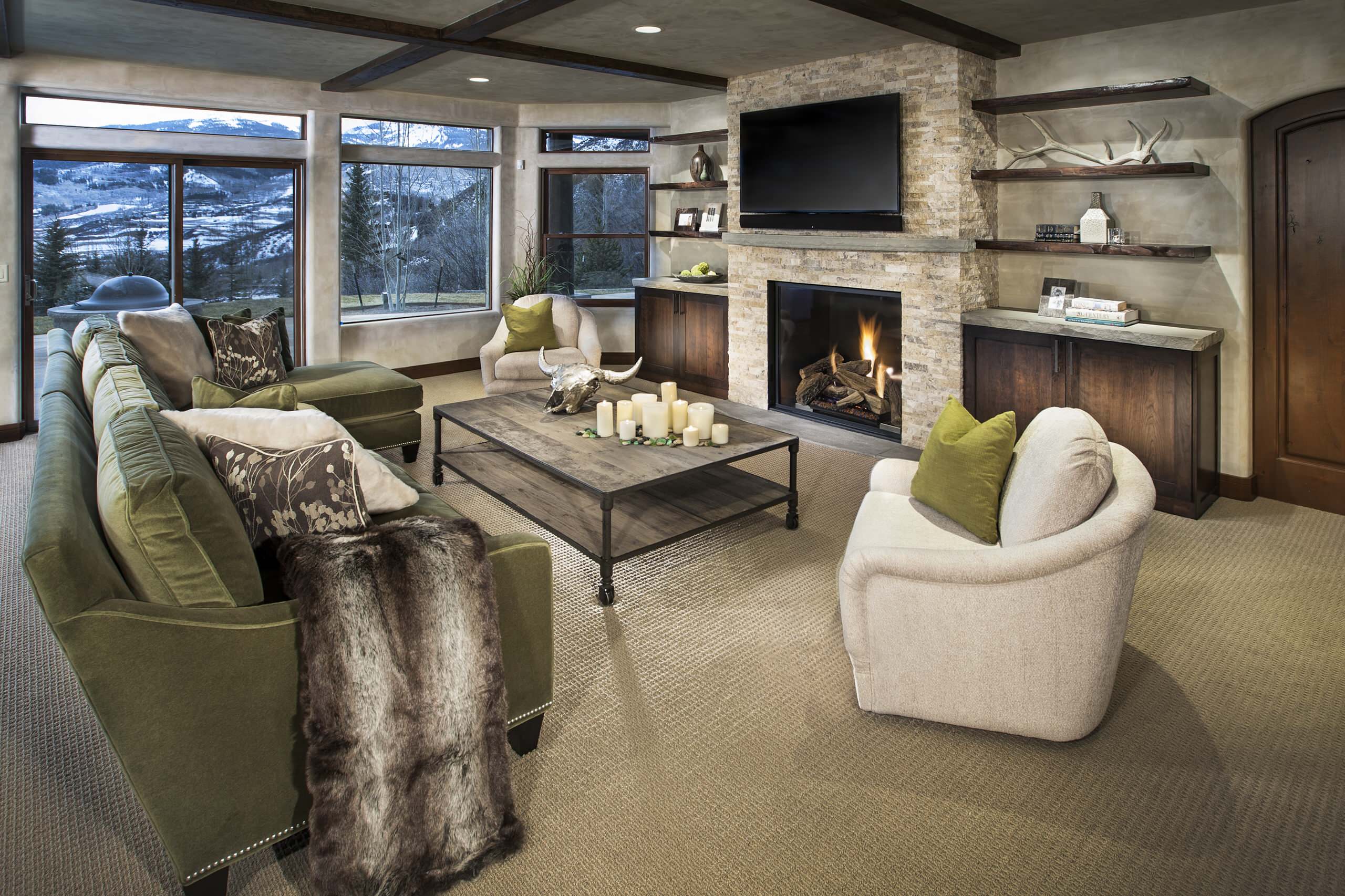 Если вы сидите на диване и смотрите вперед, то естественная линия обзора — это пространство между камином и телевизором.