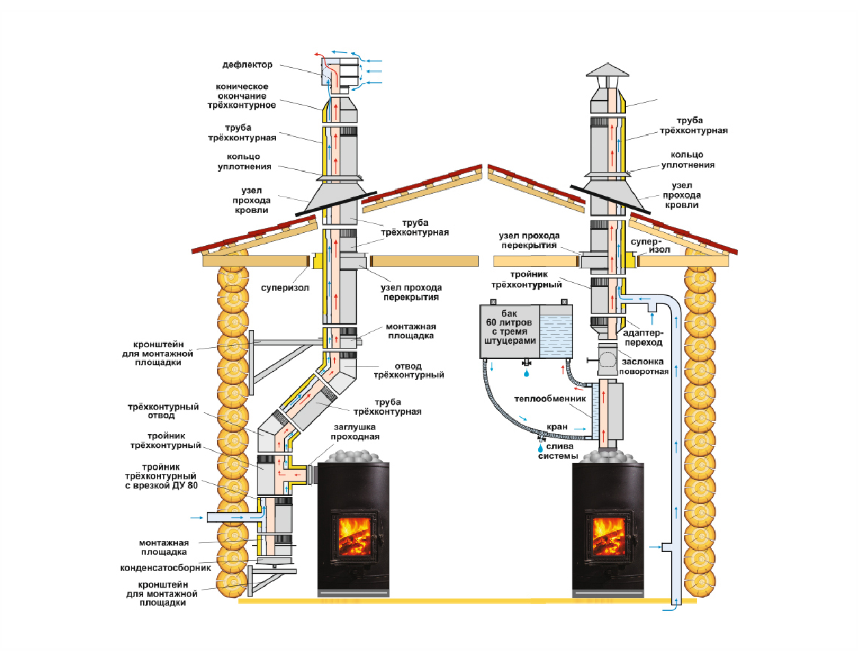 Дымоход обеспечивает тягу, от которой зависит процесс горения топлива