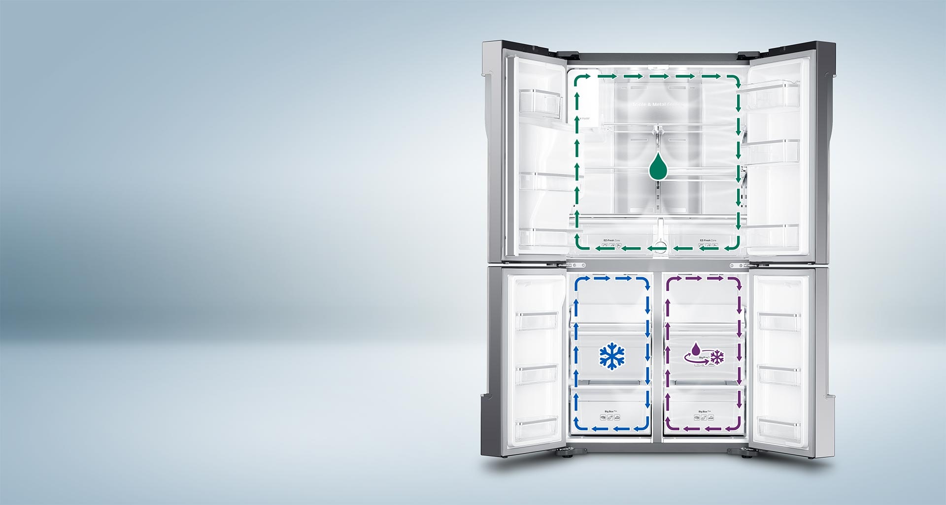 Также холодильники могут обладать статической либо динамической системой охлаждения. В статических системах воздух либо неподвижен, либо перемещается посредством естественной конвенции. Применяется в основном во многих бюджетных холодильниках. В динамической системе воздух циркулирует под действием вентилятора. Такая система получила название «No Frost» и позволяет добиться равномерного распределения температуры по всей площади камеры и быстрое восстановление заданной температуры после ее повышения. Главное преимущество такой системы – при работе холодильника на стенках камеры не образовывается иней.
