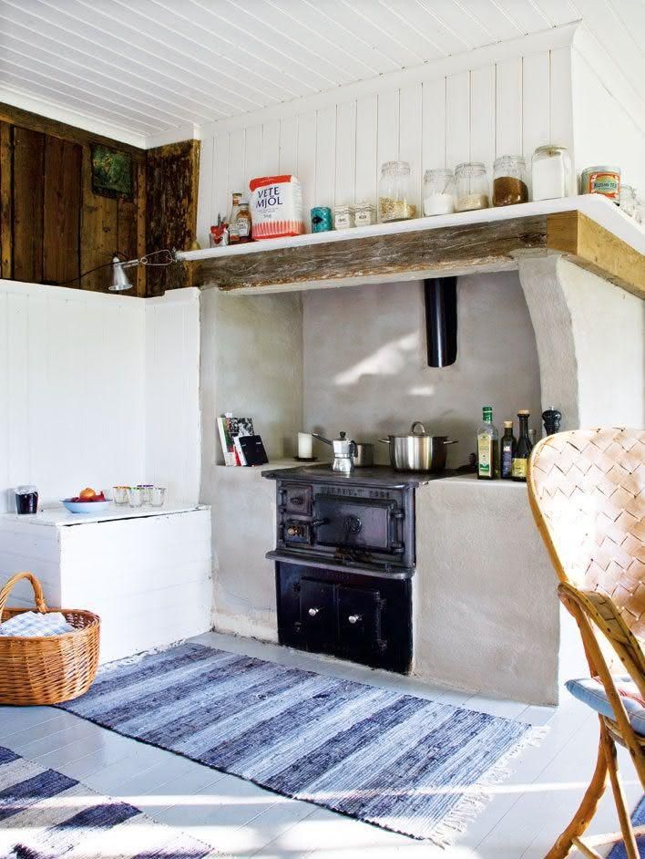 Скандинавские печи бывают для обогрева, они узкие, длинные, как труба, а бывают и для приготовления пищи, такие варианты отдаленно напоминают русскую, только меньших размеров и без уютного лежака. Кухни этого стиля белые, светлые, с деревянными или каменными полами. Стены обшиты древесиной или окрашены в белый цвет – даже кирпичная кладка подлежит окрашиванию. Много декора в виде кухонной утвари без намека на современность.