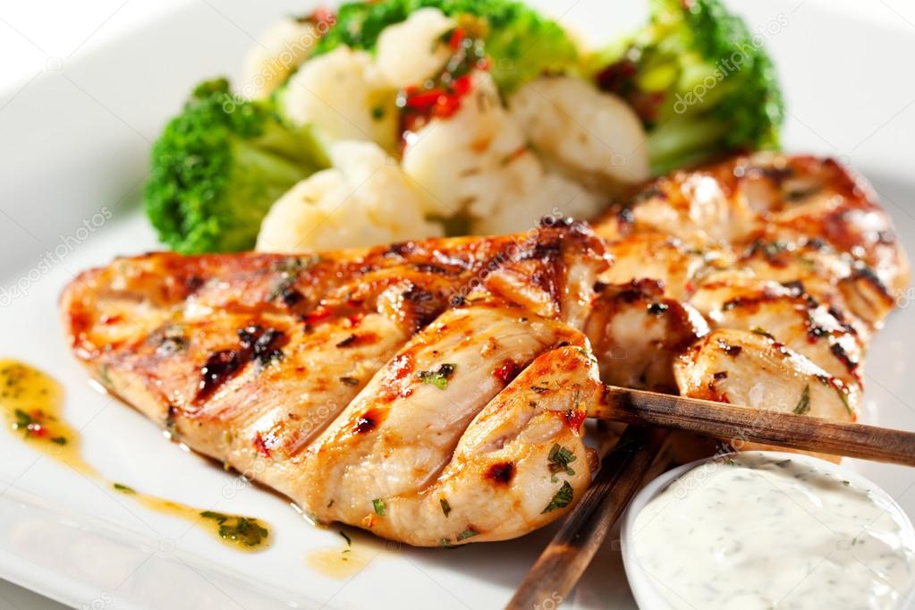 Это самый простой домашний рецепт. Вам потребуется грудка, чеснок, немного перца и хорошая порция майонеза. Чтобы блюдо было полезным, приготовьте домашний белый соус.