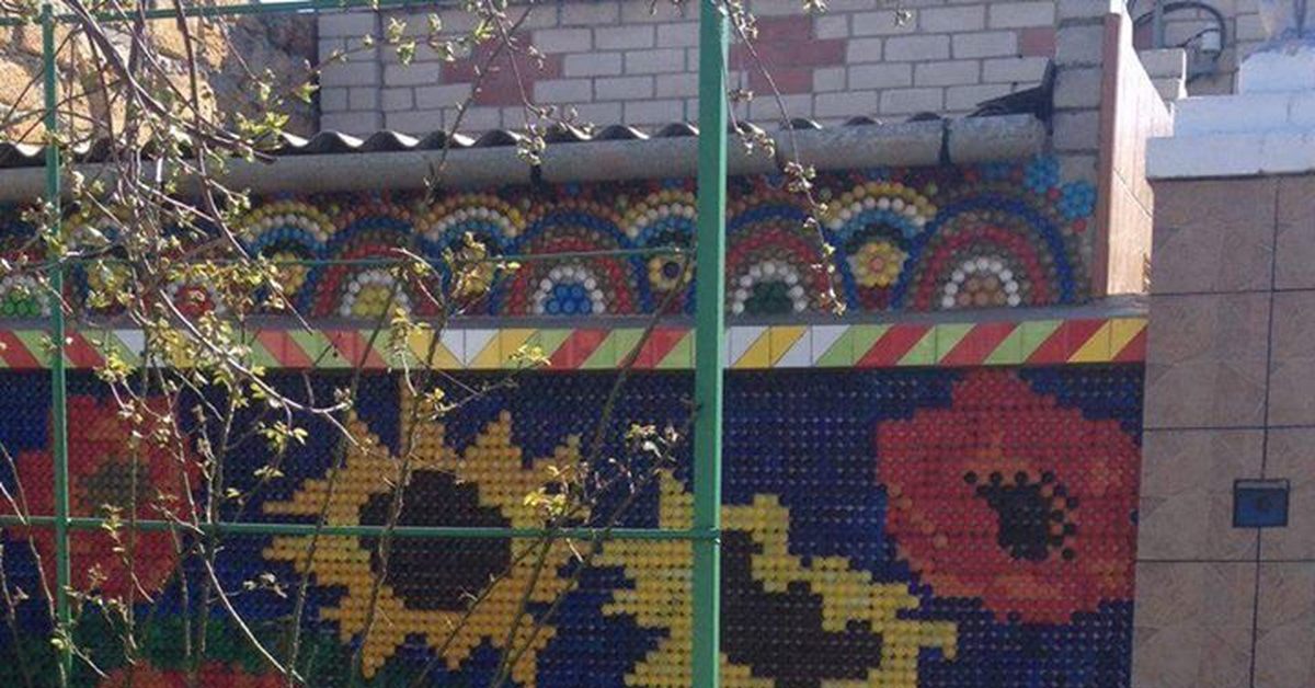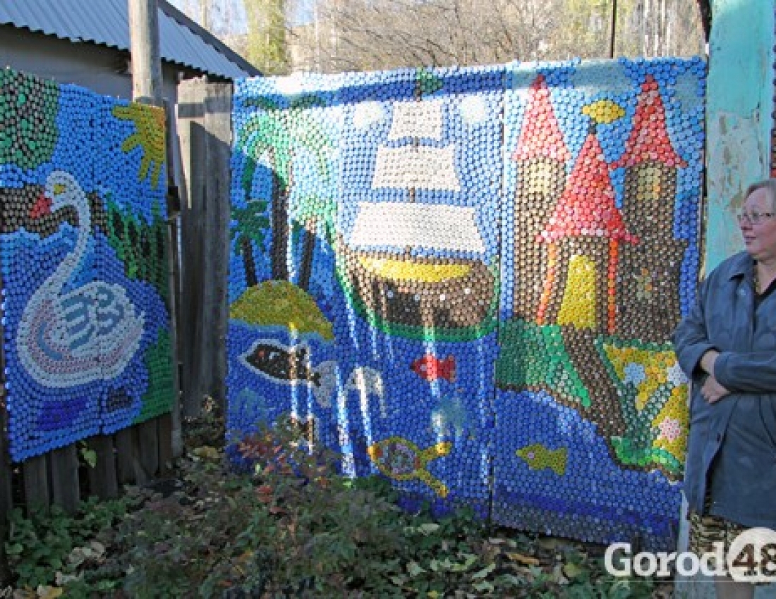Татьяна Закалина 61 год Чехия. Украсила 14 метров забора. Крышки собирали все, знакомые и родственники, за это она им очень благодарна! Главный помощник — внук Данила!