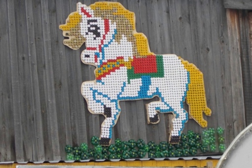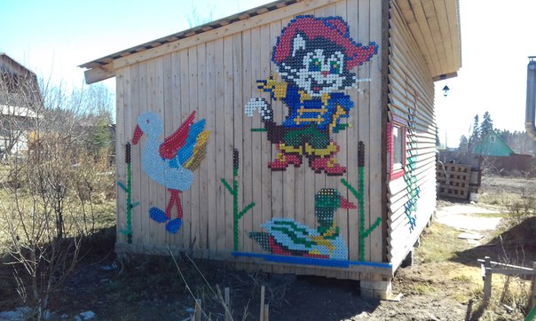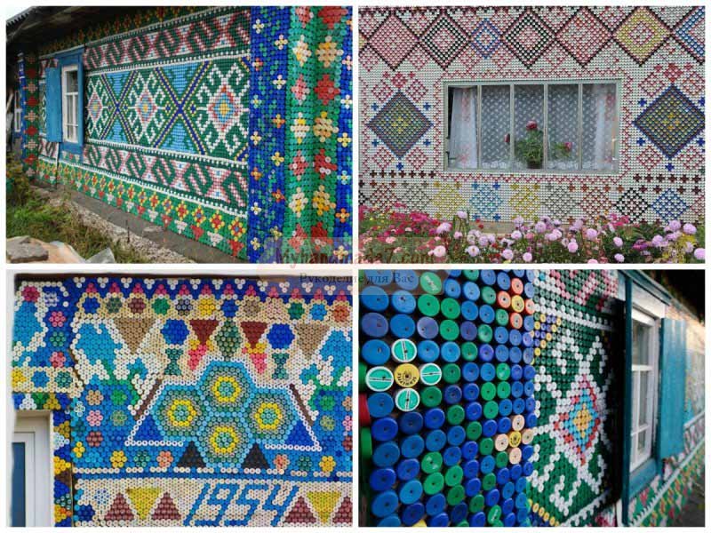 С помощью пробок от пластиковых бутылок жительница деревни Камарчага Ольга Костина превратила невзрачное деревянное строение в яркий домик. Новое направление в искусстве, что-то среднее между мозаикой и вышивкой крестиком, и выглядит потрясающе. Ольге Костиной понадобилось около 30 000 крышек для создания своих творческих шедевров. Необычно украшенный дом, стал достопримечательностью Российской деревни.