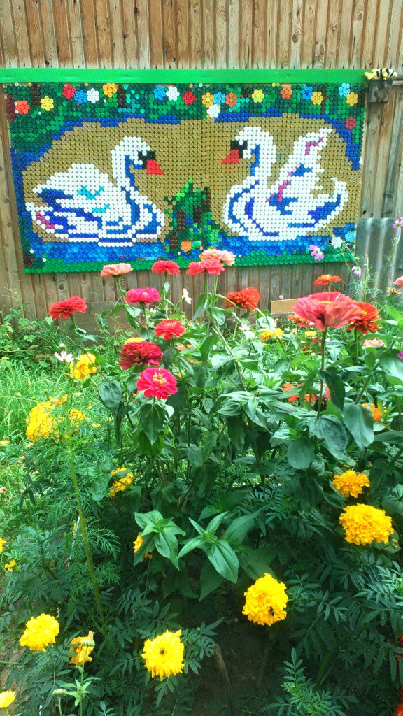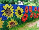 Однако, наибольшую популярность мозаика из пробок обрела для оформления дачного участка. Метод декорирования очень простой, быстрый, дешевый, оригинальный и красивый. Для дачи – в самый раз. Рисунки делаются разними. Одни могут служить в качестве орнамента и повторяться через промежутки времени, другие же являются полноценными рисунками. Если говорить о заборе, то есть и другой вариант фиксации мозаики: