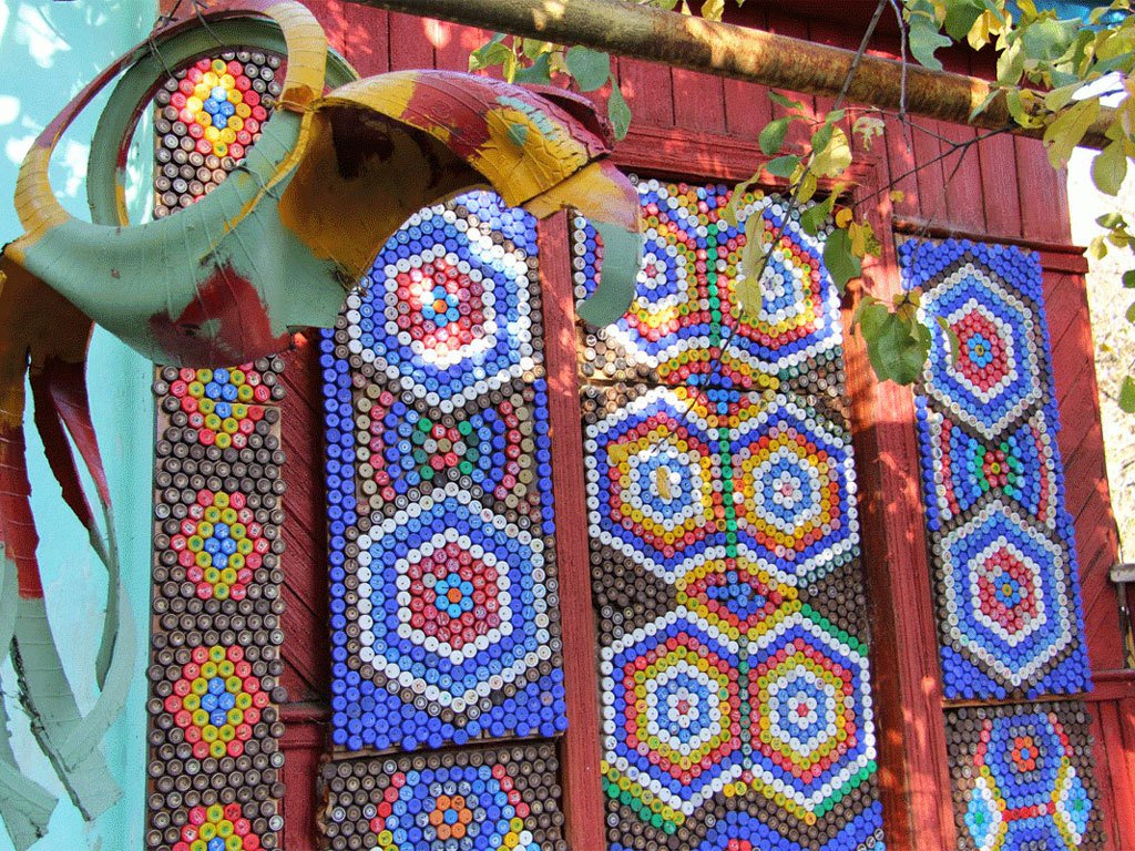Техника создания замечательных украшений предельно проста: пластиковые крышки, маленькие винты или клеевой пистолет — все, что нужно, чтобы превратить дом, забор или кусок фанеры в шедевр.