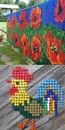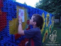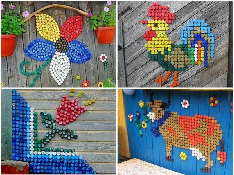 - картины из пробок от пластиковых бутылок, а именно схемы, могут делать на картоне или же сразу перенести ее на забор. Чтобы придать картине более глубокий вид и яркость, очертания наносятся цветной краской, которая будет совпадать с палитрой изображения;
