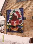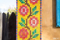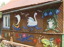 Красочная мозаика украшает старый дом в стиле русской вышивки, владелица дома добавила красок и оживила нейтральную палитру традиционно деревянных русских домов. Различные животные украшают стены дома, делая его уникальным в художественном плане.