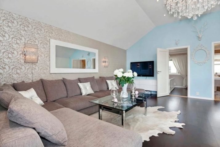 Немаловажное значение имеет и освещенность. Если зал светлый и выходит окнами на юг либо восток, хорошим выбором станут светло-серые, голубые и бело-зеленые обои.