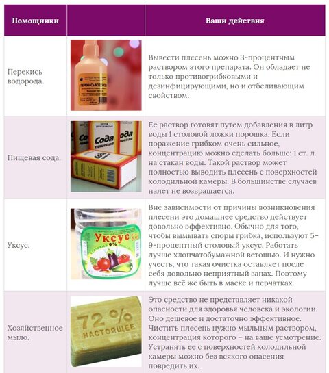 Самый простой способ устранения плесени и запаха в холодильнике — специально предназначенные для этого средства. Сегодня они выпускаются в большом ассортименте, нужно только проконсультироваться с продавцом. Применяя их, нужно тщательно соблюдать инструкцию, так как некоторые из препаратов довольно ядовиты.