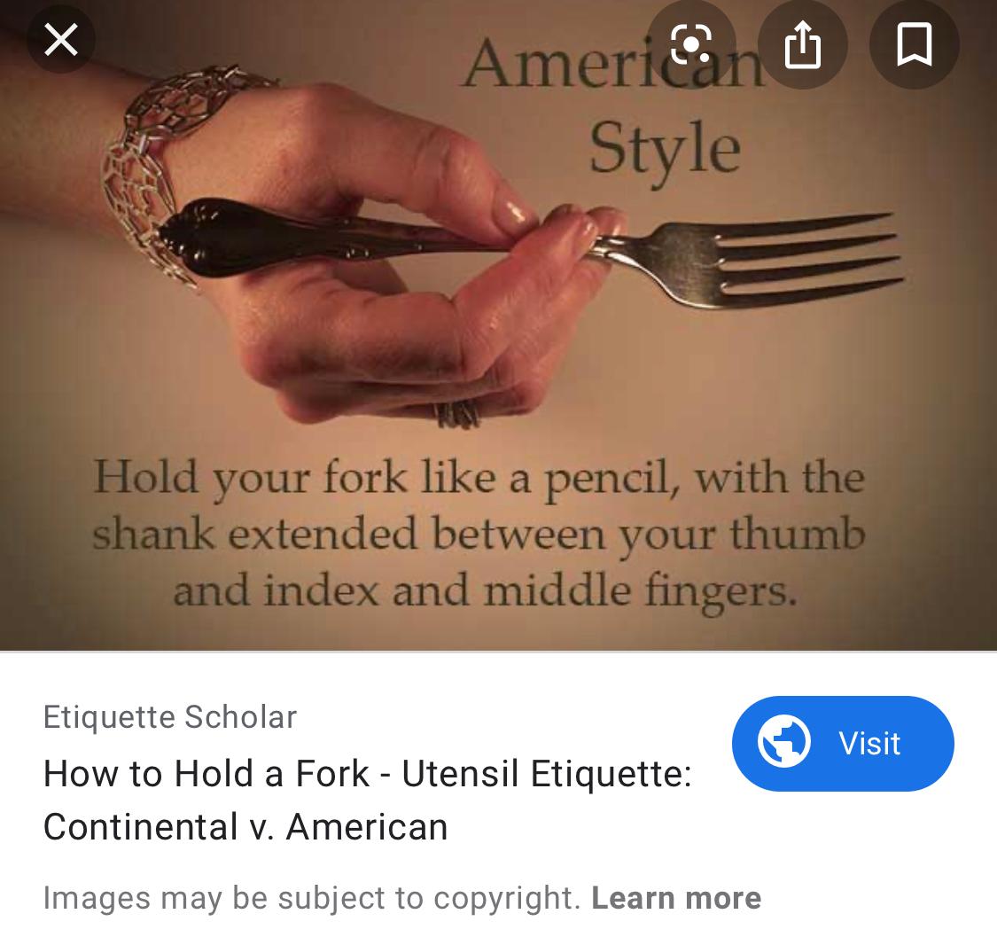 AFAIK или, по крайней мере, мне сказали, что американцы держат вилку в правой руке, поэтому такой способ еды, по крайней мере, устранит первую возможную проблему. Обратите внимание: если кто-то получил травму или не может есть правой рукой по разумным причинам (что бы это ни значило), ему / ей разрешено есть левой рукой.