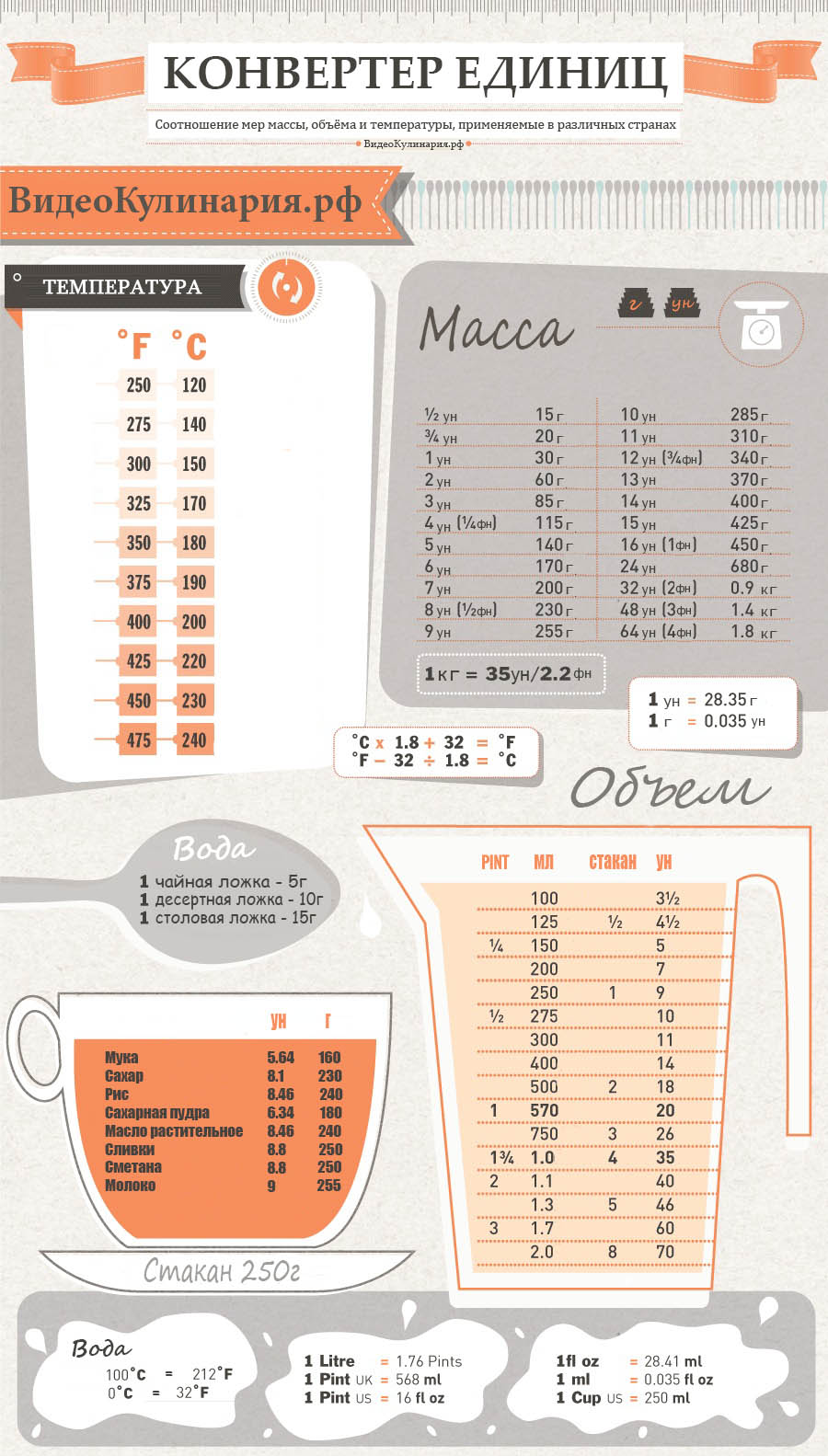 В рецептах можно встретить разное количество всевозможной жидкости. Поэтому для экономии вашего времени, мы приводим готовые расчеты мер и веса в ложках и стаканах.
