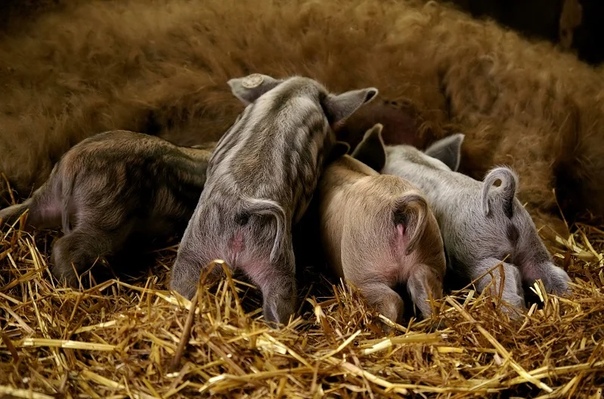 Потребности в купировании хвостов у этой породы нет. Примерно в три или четыре недели ассортимент кормов для малышей расширяют в очередной раз – теперь в меню понемногу вводятся свежие фрукты и овощи. Для поросят характерна полосатая окраска, совершенно нетипичная для взрослых мангалиц, так что уже по окрасу молодняка можно определить, когда его можно отлучать от матери.