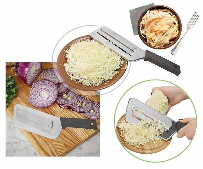 Такое приспособление оснащено стальной пластиной, на которой находится двойное лезвие. Оно расположено под небольшим углом. Это сделано для удобства нарезки кочана поперек волокон, как и рекомендуется. Пластиковая ручка также находится под углом к пластине.