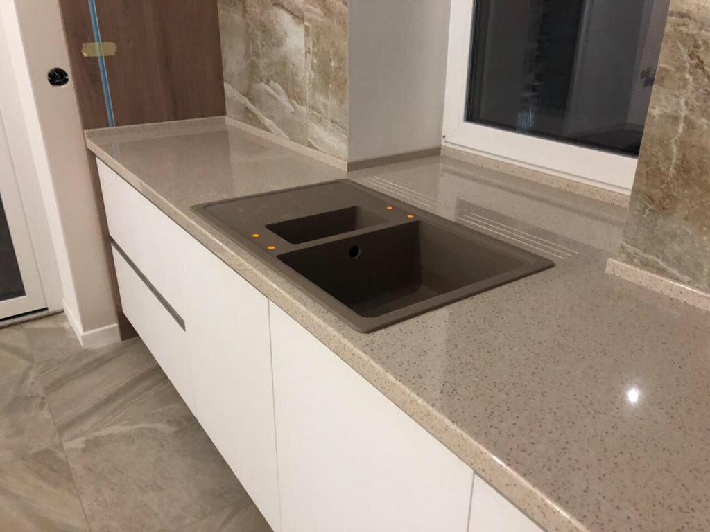 Кварцевые столешницы очень прочны и устойчивы к появлению пятен, коррозии, нагреву и сколам.Их не нужно регулярно герметизировать, как гранитные столешницы. Благодаря своей гибкости в работе кварту можно использовать на больших вертикальных поверхностях, таких как фартуки или ограждения для ванных комнат, без швов, которые возникают при установке других натуральных камней.