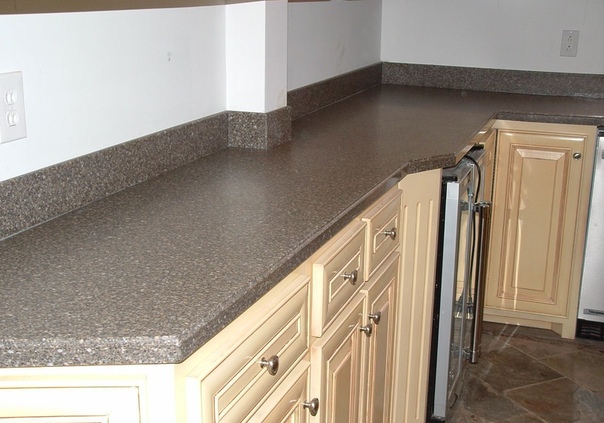 Одна из разновидностей искусственного камня, которая производится из мелкой минеральной крошки, цветовых пигментов и акриловой смолы. Эта субстанция заливается в форму, где и застывает. Но следует знать, что литая столешница не целиком состоит из акрила, а только верх, под которым находится старая добрая древесно-стружечная плита.