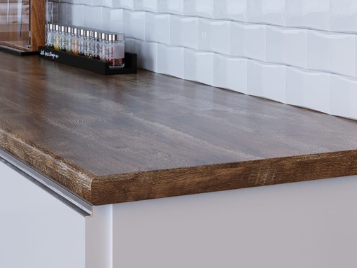 В основе такой конструкции лежит древесно-стружечная плита, сверху закрытая пластиком. В современных конструкциях он наносится с применением технологии постформинга – когда пластик обволакивает основу и формирует бесшовное соединение.
