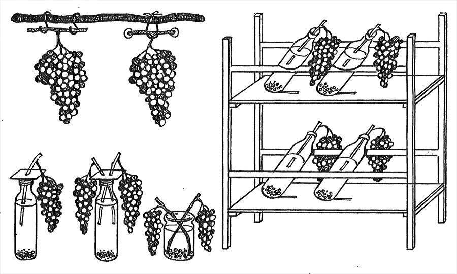 Сохранности винограда можно достичь несколькими способами. По одному из них гроздья подвешиваются на проволоке или веревке за черенок. Необходимо, чтобы гроздья не касались друг друга. Если урожай небольшой, то можно использовать способ хранения на зеленых гребнях. В данном случае виноград срезается вместе с частью лозы.