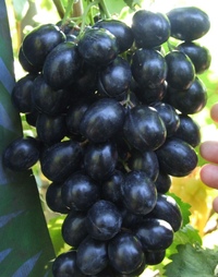 Столовый сорт дает урожай 20–25 августа. Гроздья конические, весят от 1 до 1,5 кг. Ягоды продолговатые, черного цвета, есть слабый восковой налет. Весят около 10 г, кожица плотная. Вкус сладкий, с освежающей приятной кислинкой.