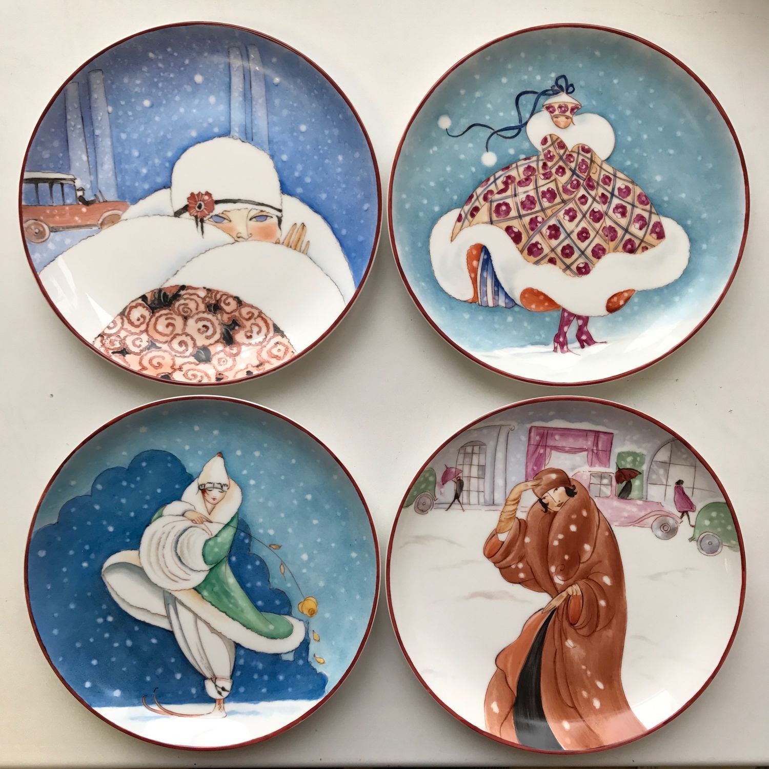 В хорошем винтажном состоянии.На одной пластине есть две крошечные сколы вдоль обода (едва заметные из-за зубчатой формы обода), а также капля темной краски (возможно, морилка) возле нижнего края обода.