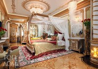Эффектная белоснежная спальня напоминает о слепящих песках пустыни. Великолепная стрельчатая ниша с оригинальным освещением и окна в арабском стиле погружают смотрящего в атмосферу сказки. Прекрасно подобранные аксессуары, такие, как люстра и резной столик добавляют колорит интерьеру.