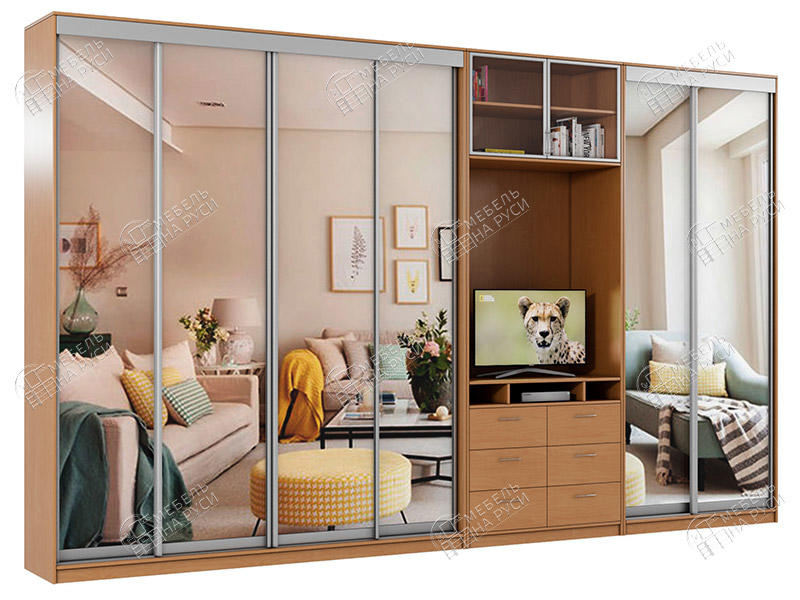 Данная модель позволяет сделать так, чтобы пространство с телевизором закрывалось раздвижной дверью, как и другие полки. Вы можете открывать его только тогда, когда захотите посмотреть телевизор. Двери такой модели могут быть одноцветными или же наоборот, можно сделать акцент на центральной части конструкции.