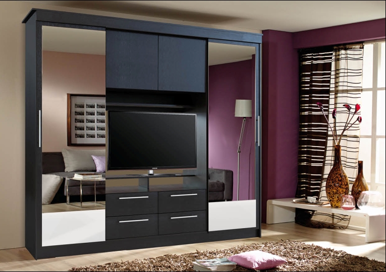 Лучше всего ставить такой шкаф в гостиной. Его не ставят в спальной комнате, особенно напротив кровати. Зато гостиную такой шкаф просто преобразит. Над телевизором находятся удобные открытые полочки, где вы сможете разместить, например, книги, фотографии. Под телевизором — тумба с выдвижными ящиками. Шкаф не нагроможден лишними деталями, кажется небольшим, но вместительным.