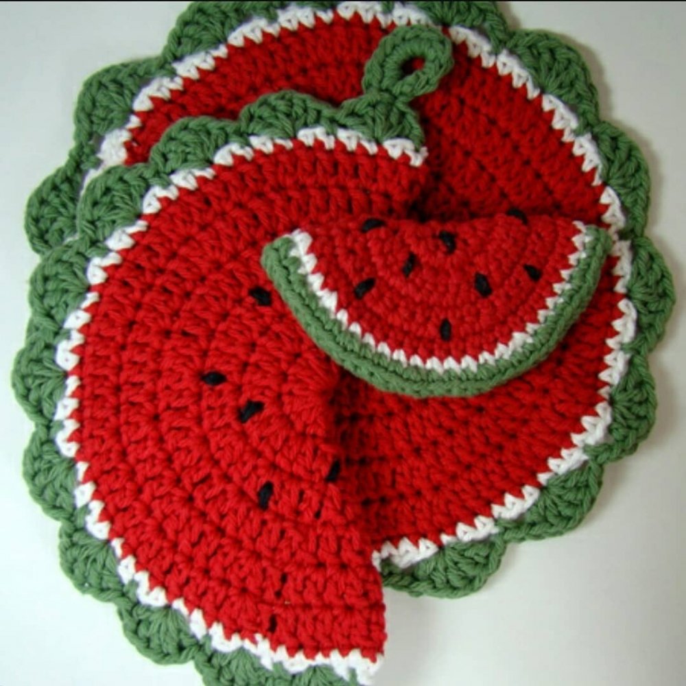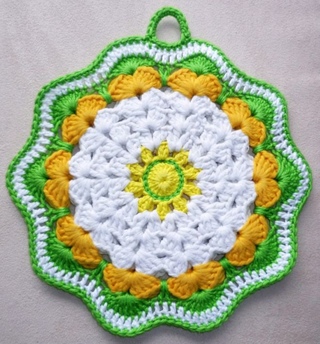 - прихватки в виде квадрата, круга, шестиугольника и любого другого мотива крючком.