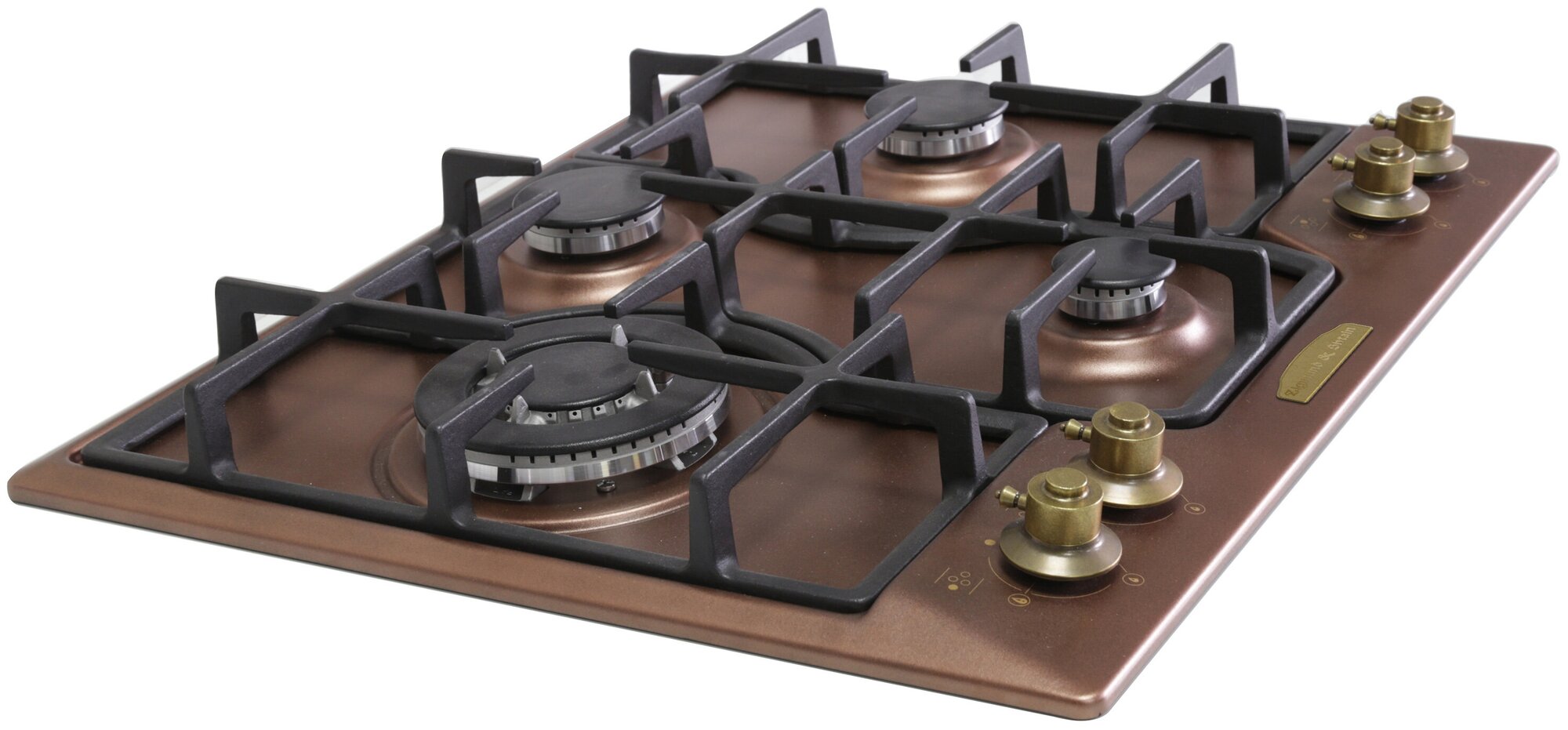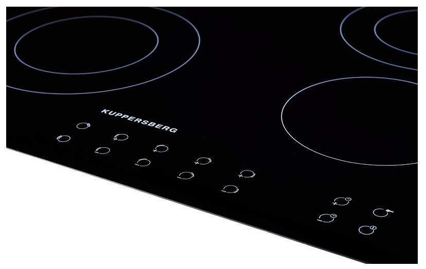 Панель «Купперсберг» из закаленного стекла имеет 5 конфорок. Центральная большого размера подходит для сковородок WOK: пламя поднимается в несколько рядов, поэтому посуда с выпуклым дном хорошо прогревается.